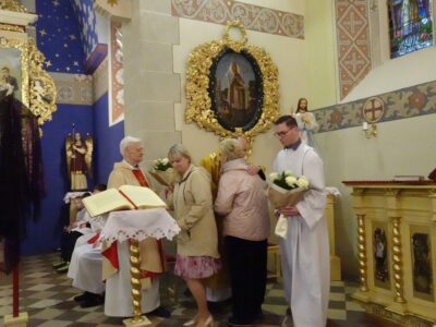 W naszym kościele liturgia Wielkiego Czwartku rozpoczęła się o godz. 18.00. Chwilę przedtem jeden z akolitów zapoznał wiernych z jej przebiegiem. Potem ministranci, akolici, księża (w białych szatach liturgicznych) procesyjnie przeszli przez kościół i podeszli do ołtarza. Mszę św. sprawowało dwóch księży: proboszcz parafii Mszano - ks. Sławomir Witkowski i ks. Jan Żymant - emeryt pomagający w naszej parafii. Liturgii przewodniczył ks. Sławomir Witkowski - proboszcz parafii. Jako, że księża mają dziś swoje święto (Dzień Kapłaństwa), dlatego na końcu Mszy św. składano im życzenia, wręczono kwiaty (białe róże i inne kwiaty), podarowano słodycze... Przedstawiciele wspólnot i grup religijnych złożyli księżom życzenia..... Ks. Sławomir Witkowski wraz z ks. Janem podziękował wszystkim za wszelką pomoc, modlitwę, ofiarność i życzliwość na rzecz wspólnoty parafialnej.